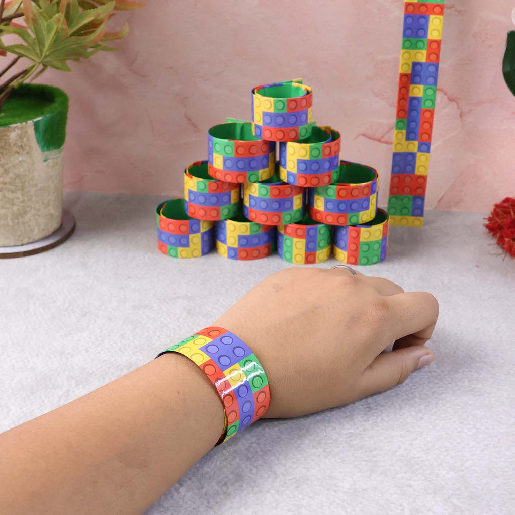 Colorful Snap Slap Bracelet Toy Set – 12 Pc Fun Wrist Band Toys for Kids, Multicolor Brick Pattern Snap-On Bracelets for Party Favors, Return Gifts & Playtime Fun